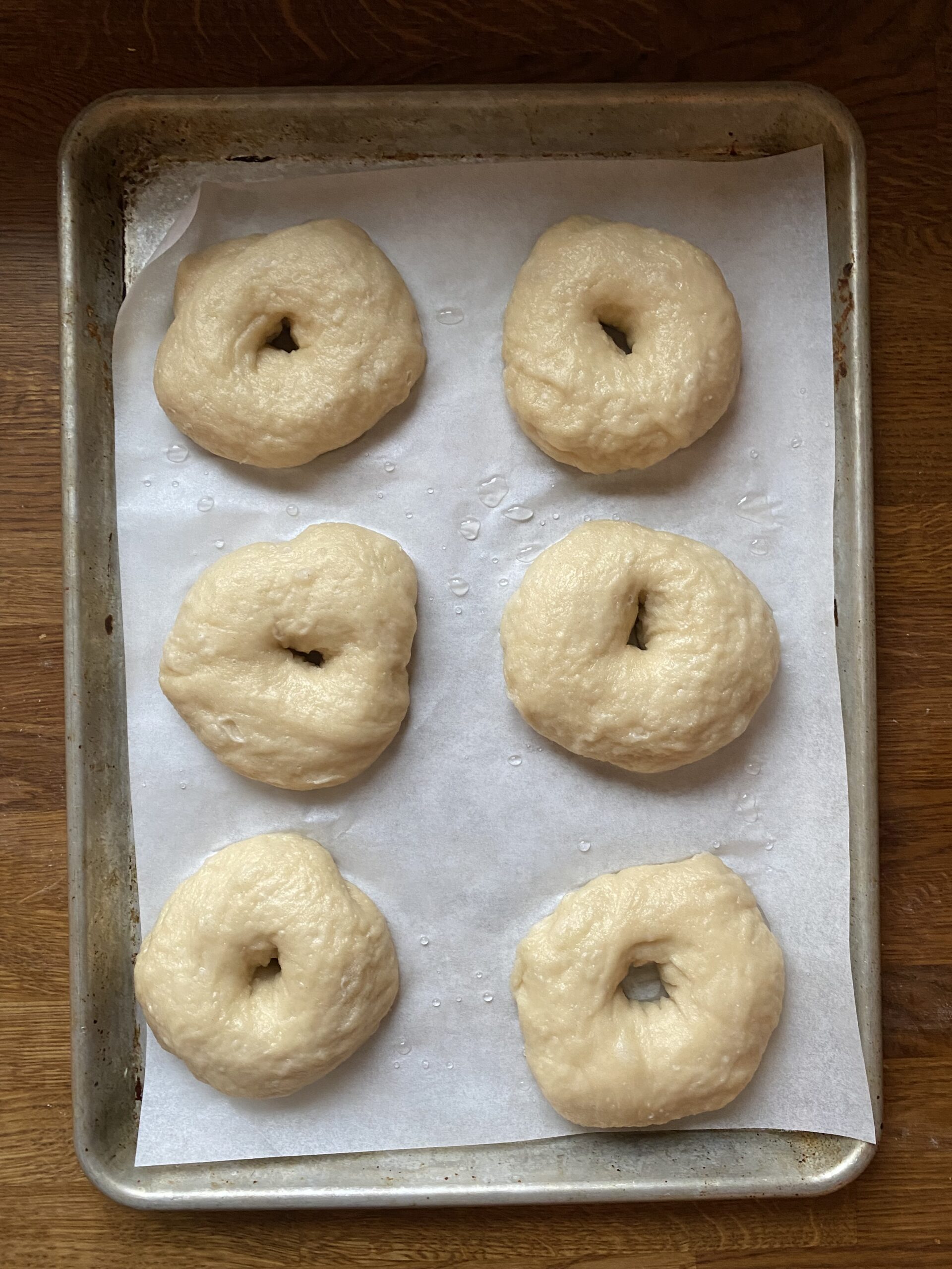 - Cut a sheet of parchment paper into 12 squares and place your shaped bagels onto those to rise. When it's time for their water bath, you can put the whole thing - parchment paper and all - into the bath. This makes the transfer way easier! Remove parchment paper with tongs when the bagels are boiling - it will peel right off. You can even dry the pieces and reuse them for future bagels!
