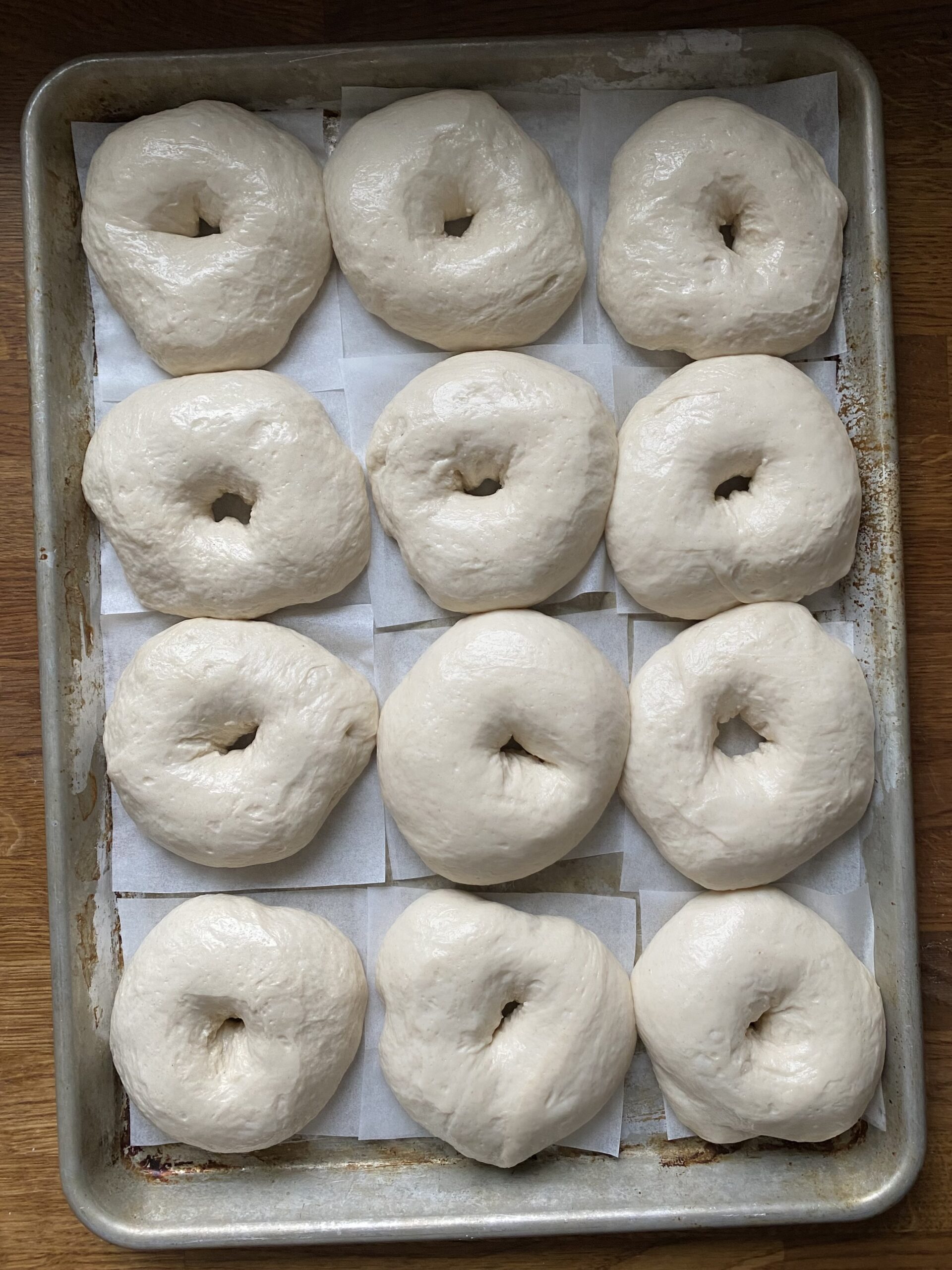 - Cut a sheet of parchment paper into 12 pieces, roughly 3" square each. Get out a large baking sheet.Turn the dough out onto a very lightly floured work surface. Deflate the dough and divide into 12 pieces, roughly 150 grams each. Form each piece into a ball, then cover loosely with plastic wrap and let rest on the countertop 15-30 minutes to relax the gluten.For this next step, you'll be working with one ball of dough at a time and you want to be sure to keep all the other pieces of dough covered - it tends to dry out quickly. With one ball of dough at a time, poke a hole in the center all the way through to the countertop. Lift the dough off the countertop and gently stretch out the hole. Using both hands, roll in the air on your pointer fingers to stretch further. Make this about 2x as big as you want it in your finished bagels - they will shrink a lot during baking! Place on a square of parchment paper on a baking sheet and cover. Repeat with the remaining pieces of dough. Cover very well with plastic wrap and let rise 2-3 hours, until significantly puffed up. (You can also refrigerate at this point and let them do the second rise overnight!)