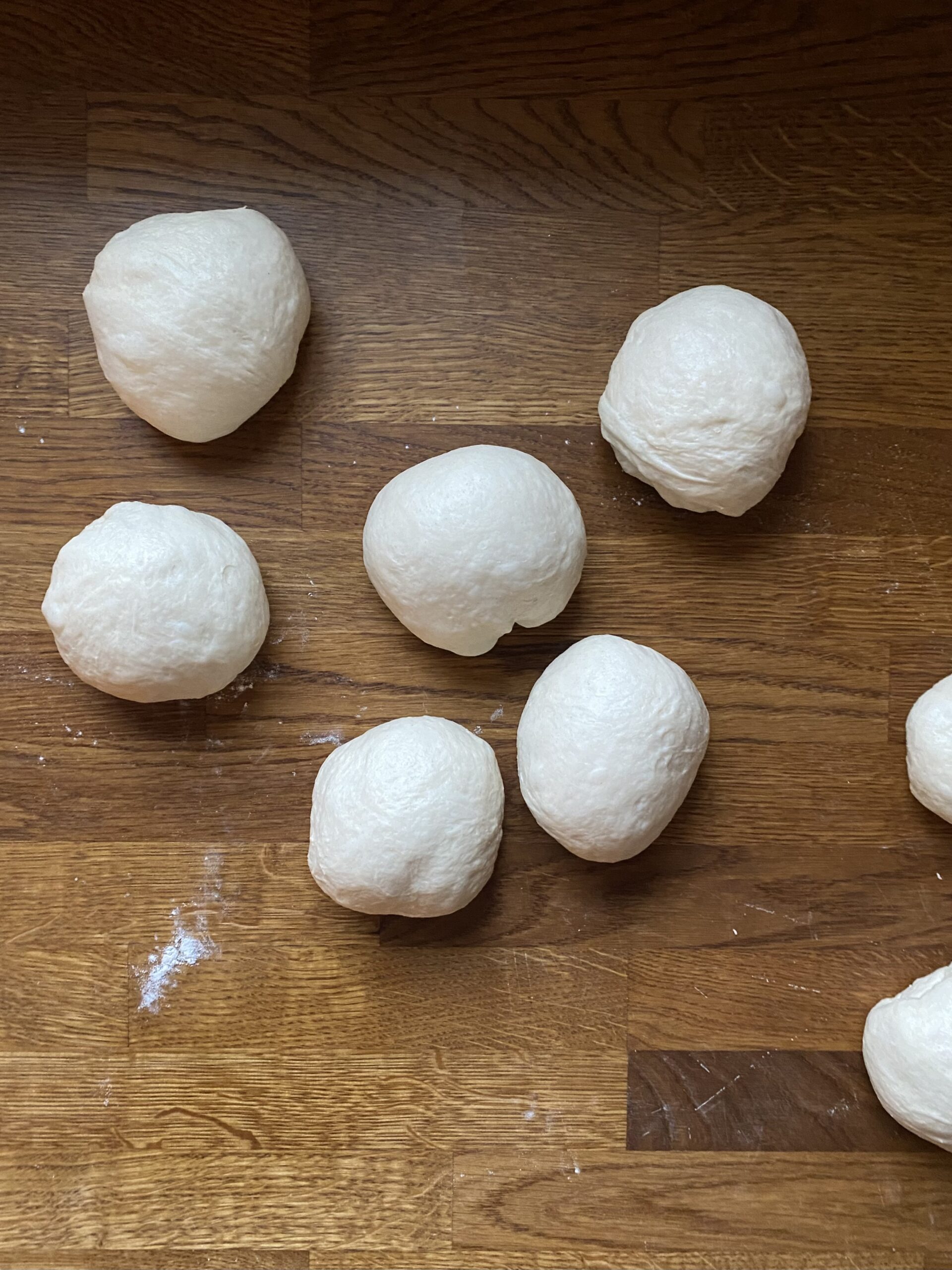 I'm giving you some shaping options because different people find different methods easier! No matter which method you use, you'll start by deflating your dough a VERY lightly floured surface and dividing it into 12 pieces. This is a rare recipe where I actually use my scale to weigh dough pieces - each should be about 150 grams.