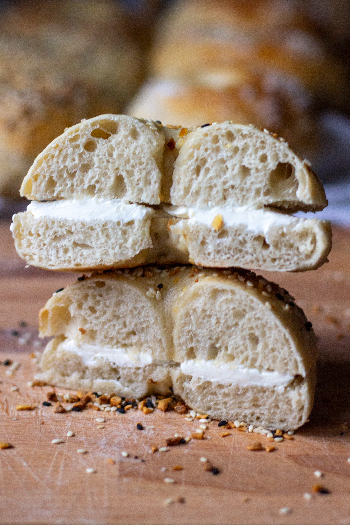 You MUST eat one warm. It's the law of making your own bagels. These take roughly 15 hours from start to finish and it's worth every second for that first bite of a warm, chewy, fresh-from-the-oven bagel with cream cheese layered thick and slightly melty.