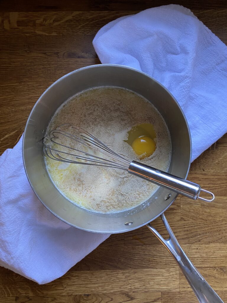 After you've made sure the butter/milk/water isn't too hot, add in the discard, egg, yeast, and sugar and whisk until smooth.