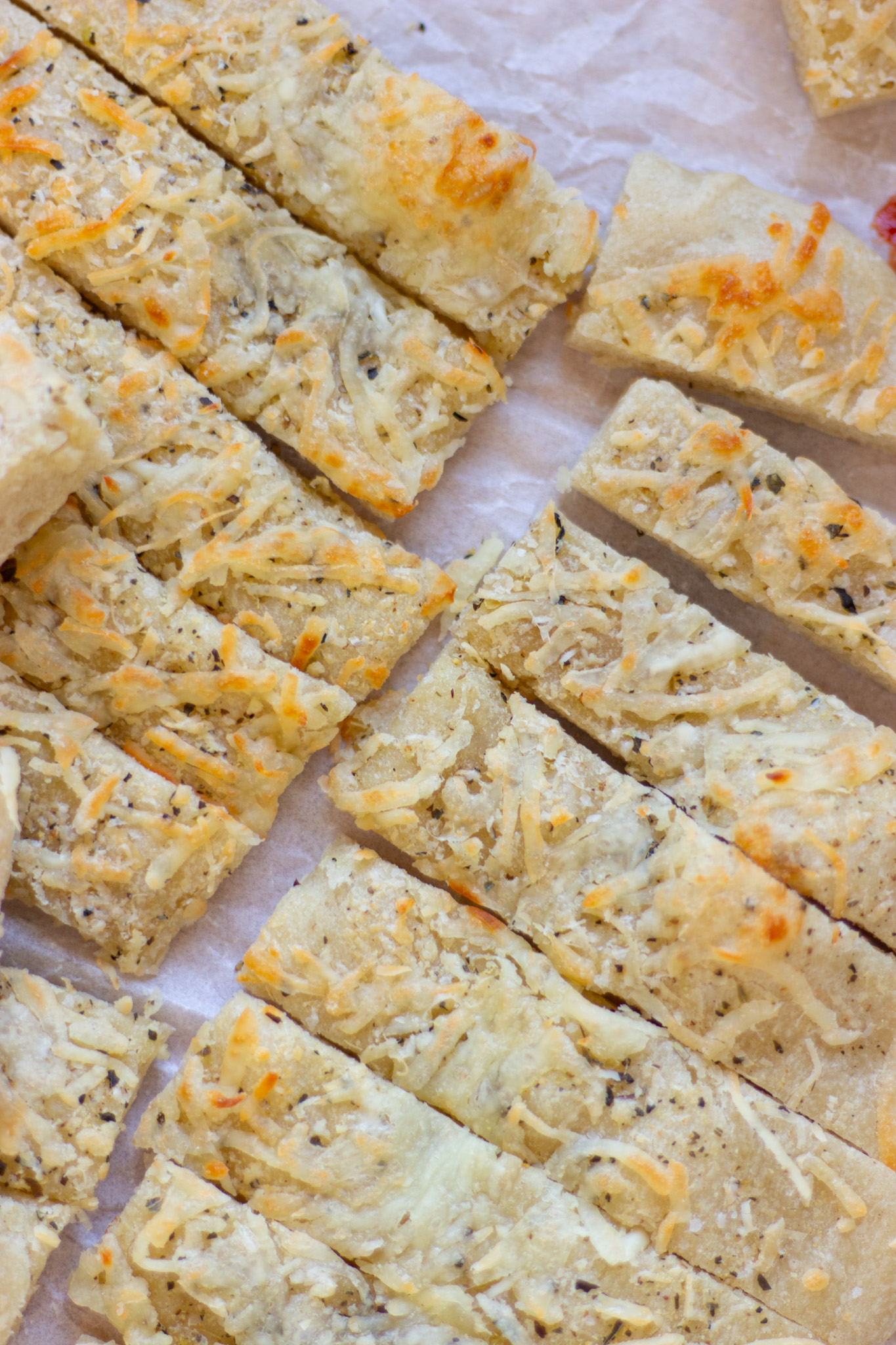 - Lightly grease a baking sheet with olive oil. In a small bowl, combine the garlic powder, dried basil, dried oregano, salt, and pepper. Turn the dough out onto the baking sheet and use your hands to spread dough to roughly ½-inch thick. Be sure to pop any large air bubbles that may have formed during the first rise. Brush with the melted butter and sprinkle seasonings over top. Cover with plastic wrap and let rise 1-2 hours more.Preheat oven to 400 degrees. Top the dough with the cheeses. Bake for 15 minutes. Transfer to a cutting board and use a pizza cutter to cut into sticks. Serve warm with marinara sauce.