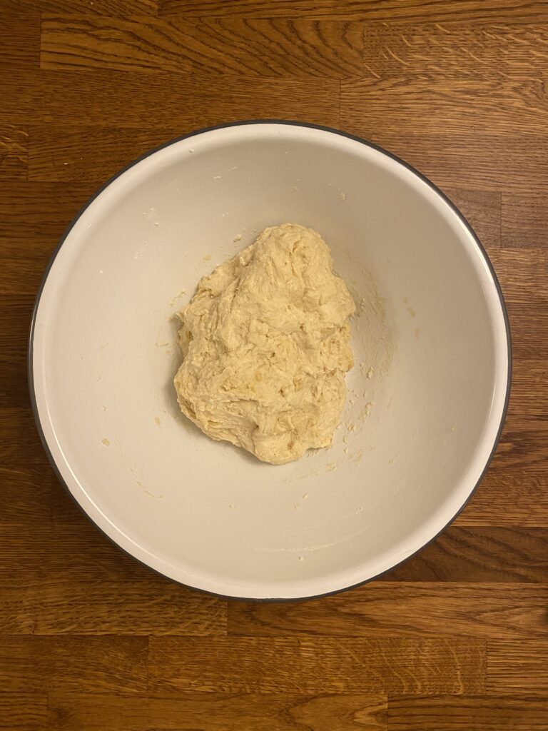 Then, take the dough out of the bowl and gently knead a few times to ensure it’s all mixed and to shape it into a nice ball. Cover again and let it rise.