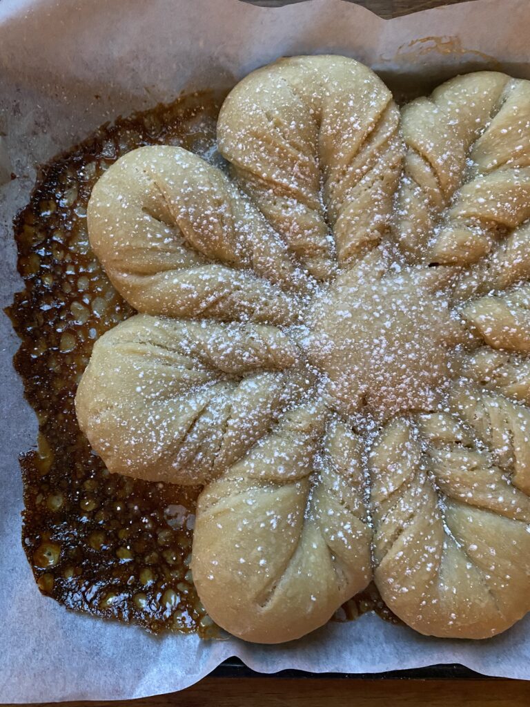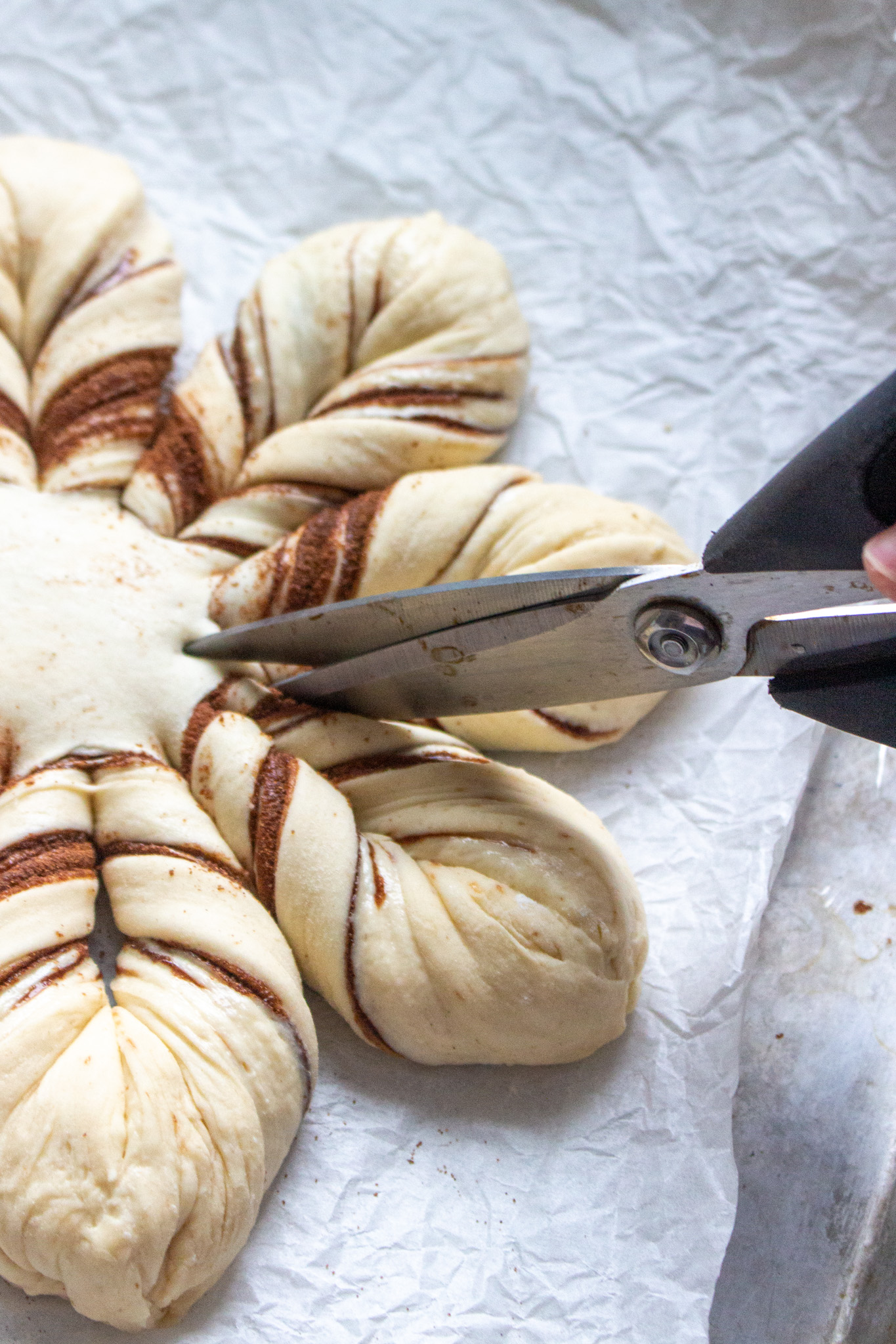- Place a small round glass or bowl into the center of the assembled dough and press lightly to indent. Using a bench scraper, make four slices evenly around the circle from the perimeter of the circle inward, stopping when you get to your mark. You should have even "15-minute" marks around your circle. Make four more cuts, spaced evenly between the first round of cuts. Cut each piece of dough in half again, being sure to stop at the indented circle. You will now have 16 tails on your dough circle.Grab two adjacent pieces of dough and twist them away from each other. Make three rotations, then pinch the ends together to seal. I like to tuck the top of the point under the bottom to seal it well. Do this all the way around the circle. If you want to emphasize the center star, you can take a pair of kitchen shears and snip the base of each point roughly ½-inch inward. Carefully transfer the parchment paper onto the baking sheet. (If you want to bake later, you can cover very well with plastic wrap and place in the fridge at this point.)Bake for 25-30 minutes, until baked through and browned to your liking. If the points of the star are browning too quickly, tent them with foil. Cool for 10 minutes, then dust with powdered sugar and enjoy warm.