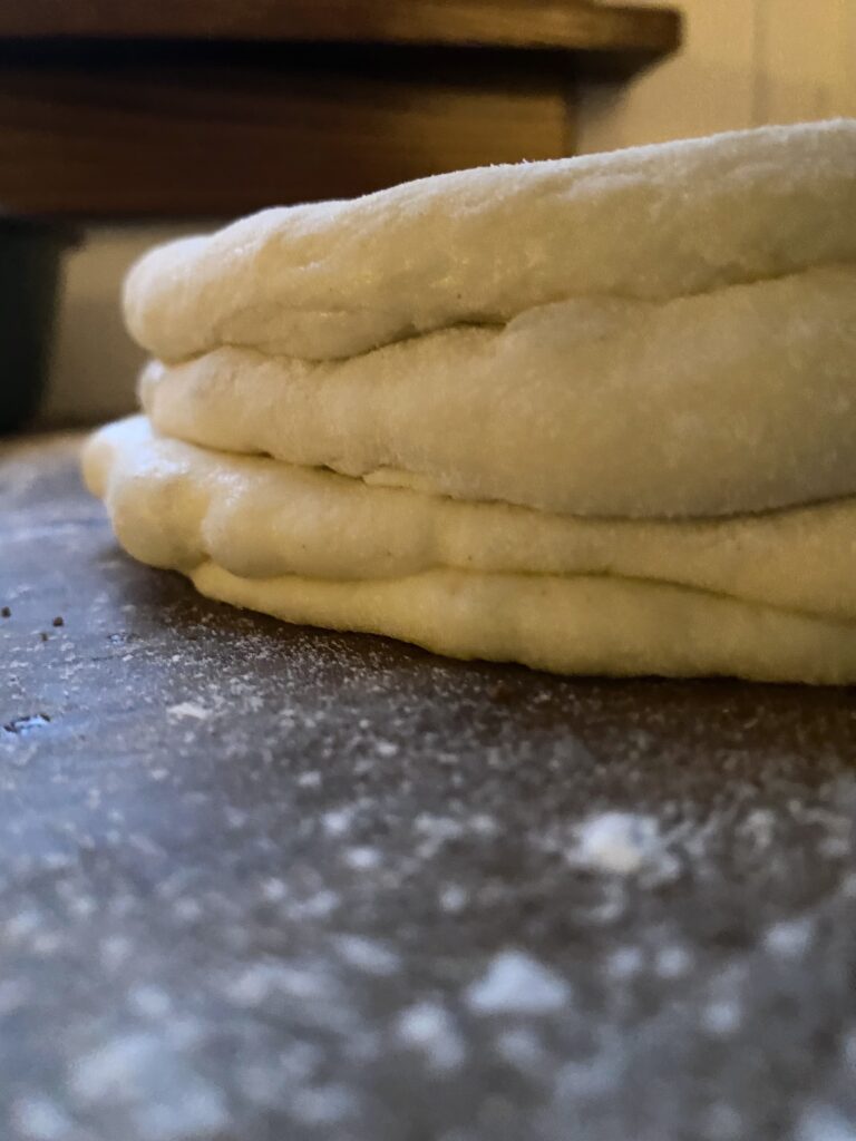 My trick here is to start with small rounds of dough when assembling, then roll the full stack out to the size you want.