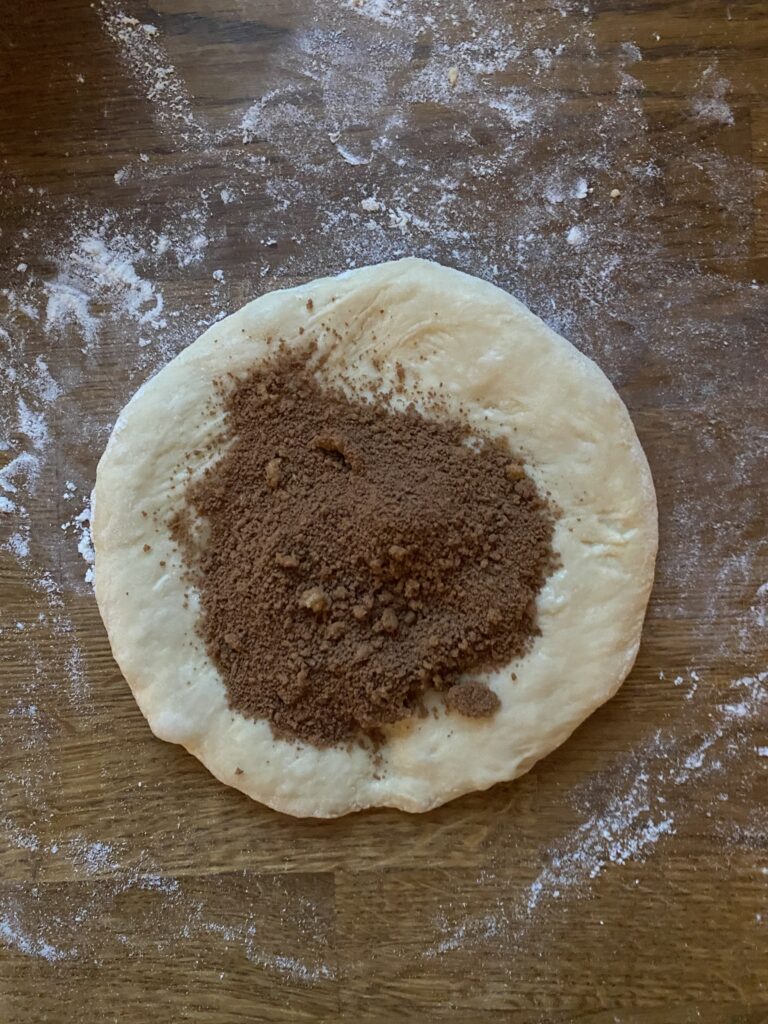 - Turn the dough out onto a lightly floured surface and divide into 4 roughly equal parts. Form each into a ball and let rest for 5 minutes. Meanwhile, preheat the oven to 350 degrees. Grab a baking sheet and a piece of parchment paper and set aside. Prepare the filling by combining the brown sugar, cocoa powder, and cinnamon in a medium bowl.Take one ball of dough and roll it into a roughly 7-inch round on a lightly floured work surface. Add flour as needed to prevent sticking. You can also pick it up and stretch it to get it into the shape you want. When you're happy with the size and shape, place it on your work surface, wet your fingertips with water, and run them along the top of the dough. Sprinkle with ⅓ of the filling mixture, leaving a ½-inch boarder along the perimeter of the circle. Set aside.Begin rolling another ball of dough into a 7-inch round. You want it to be the same size as the first one. Place it on top of the first round, sandwiching the filling between the two layers. You can stretch it as needed to met the edges of the first layer. Wet your fingertips again and moisten the top of the newest layer, then sprinkle with ½ of the remaining filling. Remember to leave a boarder uncovered so the next layer of dough can stick.Repeat this with the remaining two pieces of dough, using the last of the filling between them. When you're done, you'll have a high stack of dough, with no filling showing between layers.Take the stack and place it on a lightly floured surface. Flour the top and roll into a roughly 10-inch circle. You can flip the dough over, and turn it as needed to get a nice circle. Transfer the dough to a piece of parchment paper.